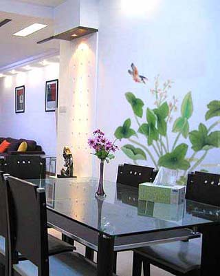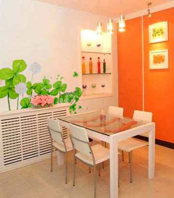 家庭餐廳背景墻的顏色適合較淺的顏色為宜。比如說:淡藍(lán),淺粉,淡黃,橙色等等。。。這些背景色給家人在用餐時(shí)無形中提供了個(gè)好心情,好胃口。