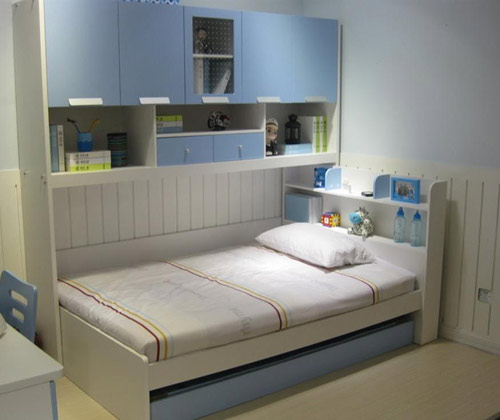 能夠組合的家具盡量組合在一起,比如做成高低鋪的床,床的下面就是孩子的寫字臺(tái)、儲(chǔ)物柜等,這種床占地面積不到4平方米,然后只要再增加一個(gè)衣柜就行了,特別適合小戶型家庭,房間正當(dāng)中的空間可留出來供孩子玩耍、游戲。