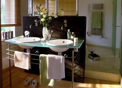 洗面盆臺面下的空間安置了帶透明門的收納柜子,里面的物品一目了然,卻不礙觀瞻。一道普通的半隔斷分離出一個獨立的洗衣間,一道軟百葉簾又將這個洗衣間巧妙地隱藏起來。整齊有序的空間著實令人羨慕,其實只要你愿意,在自己的家里也不是不能實現(xiàn)。
