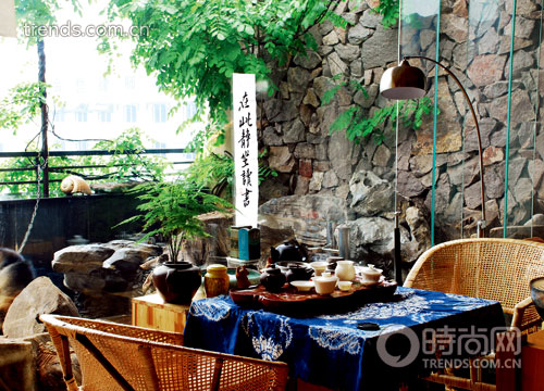 大可運(yùn)用大量的山石和藤蘿將戶外設(shè)計(jì)得古色古香,主人不僅在此品茗,更在此**讀書。