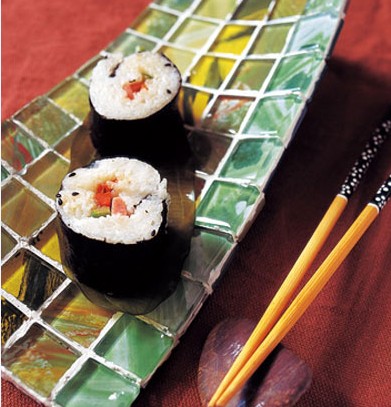 看慣了家里的平盤,這款自由扭轉(zhuǎn)的壽司盤是否給了你一點(diǎn)點(diǎn)驚喜?新型的玻璃馬賽克本身就有裝飾的花紋圖案,有點(diǎn)寫意,很適合做壽司盤,強(qiáng)化了它濃濃的東方味道。不過,由于它不是平的,制做起來就多了道工序,兩層馬賽克之間就需要夾進(jìn)一層薄的鐵板或者鐵網(wǎng),以固定它的造型。