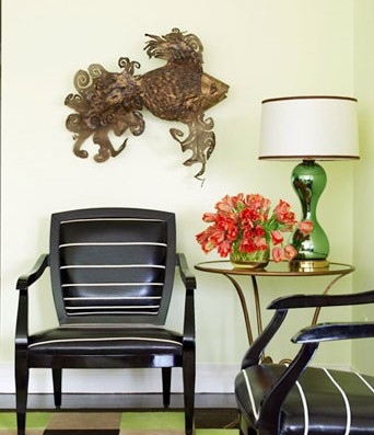 客廳轉(zhuǎn)角處布置了一個小區(qū)域,適合兩個人近距離攀談。椅子簡潔輕巧,如果有需要,還可以挪到客廳沙發(fā)處,大家一起聊。墻上的金魚裝飾很有個性。