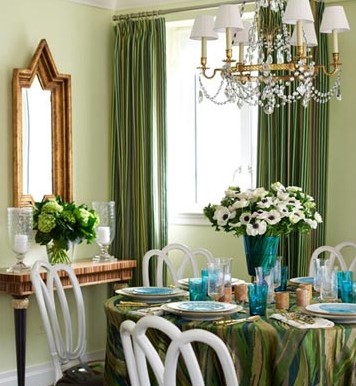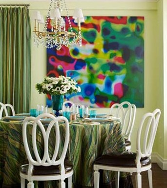 餐廳與客廳相連,同樣圍繞綠色鋪開,色澤選用得當(dāng),再配上白色的椅子和吊燈,避免了過強(qiáng)的視覺刺激。五彩斑斕的版畫是唯一比較夸張的點(diǎn)綴。