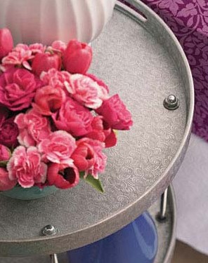 三個托盤、一些五金零件就能組成一張床頭桌!到五金商店購買4根90厘米長的金屬桿、24個墊圈、20個螺母、8個螺帽。在托盤上等距離鉆孔,注意每只托盤上的鉆孔要能對得上。將托盤組裝到一起并固定牢,在支撐桿頂部與底部加螺帽。銀色小桌是床頭的亮點搭配,書籍、鮮花、臺燈各居其位,時尚又實用。