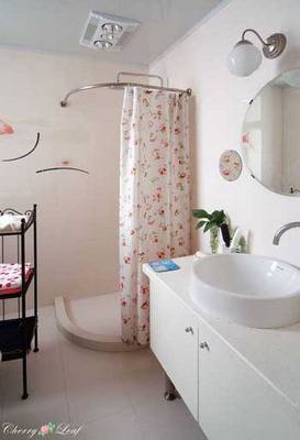 衛(wèi)生間有洗漱、妝容等功能,因此既需要有收納洗漱用具的柜子,又需要有至少一面梳妝用的鏡子。此法恰恰將這二者合二為一,將鏡子貼在水盆上方的柜門上,梳妝起來也很方便。小戶型房間的浴室往往空間狹小,因此若再采用玻璃做沖淋區(qū)的隔斷,就更顯局促。所以,在這樣的浴室空間里,宜在墻角沖淋區(qū)域用1/4圓形浴簾充當(dāng)干濕區(qū)的隔斷物。