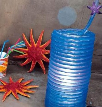 材料:塑料水管、顏料、水、膠槍再普通不過(guò)的一段水管,一圈圈盤起來(lái),注入預(yù)先調(diào)好的淡藍(lán)色液體,便成為一款略帶憂郁的小燈。光從半透明的材質(zhì)中透出來(lái),月色般朦朧。