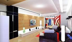 設(shè)計解說:現(xiàn)代主義的平板電視墻一般不采用過多的修飾,墻面多使用簡潔的色彩作為裝飾,可設(shè)置一個低矮的柜子作為置物之用,并可在矮柜上擺放具有現(xiàn)代設(shè)計感的裝飾物。搭配上可與整體的沙發(fā)、后墻以及隔斷相配合。一般面積較小的居室里適合現(xiàn)代風格的裝飾。