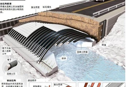 橋梁不是由鋼或混凝土構(gòu)成,而是由23條碳和玻璃纖維織物的拱形結(jié)構(gòu)組成。這些直徑12英寸(約合30厘米)的管子,通過(guò)膨脹、彎曲成適當(dāng)?shù)男螤钤儆盟芰蠘?shù)脂進(jìn)行硬化,并排安裝以后用混凝土進(jìn)行填充,就像是意式通心粉一樣。最后鋪上橋板和壓實(shí)的土壤,拱形結(jié)構(gòu)就能支撐標(biāo)準(zhǔn)的砂和瀝青路面了。