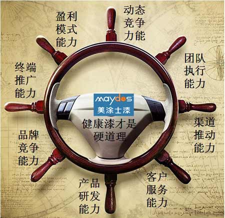 如果從這個(gè)角度看,對(duì)于已經(jīng)走出生存期的企業(yè),特別是要做大、做強(qiáng)的企業(yè)來說,就必須減少短板,并構(gòu)建綜合能力。“在短兵相接的涂料市場(chǎng),單一能力已不具有競(jìng)爭(zhēng)優(yōu)勢(shì)。為此,美涂士已形成了體系化的八大能力戰(zhàn)略組合?!比蔚轮覍?duì)記者說:這不是一個(gè)空泛的概念,而是來自于每一個(gè)實(shí)實(shí)在在的營銷環(huán)節(jié),這是關(guān)鍵營銷子行為的合力,并且是有機(jī)的整合。”從上面我們也可以看到,在每個(gè)能力戰(zhàn)略下,美涂士都有落地策略、實(shí)際效果。同時(shí),每個(gè)能力之間都是息息相關(guān)的,這也保證其不會(huì)出現(xiàn)散點(diǎn)和斷裂。最后,任德忠還補(bǔ)充道:“上述的八大能力只是一個(gè)個(gè)散點(diǎn),只有在美涂士做‘健康漆第一品牌’的戰(zhàn)略主線下形成合力,并連接成戰(zhàn)略主線,最終才形成企業(yè)的戰(zhàn)略輪舵?!?nbsp;