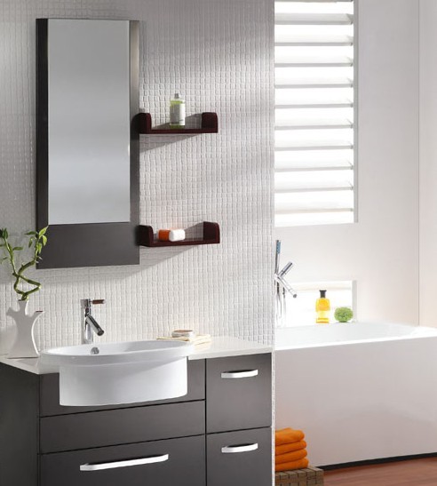 無論是在臺盆表面還是在浴室柜的臺面上,放過多的清潔衛(wèi)生用品都會顯得雜亂無章,而且容易碰倒,因此不妨在面盆上部貼墻的位置釘上10厘米寬的擱板,只要能放得下化妝瓶、刷子、洗漱杯等便可以了。擱板高度以不妨礙使用水龍頭為宜,材料可選用木板、玻璃等。