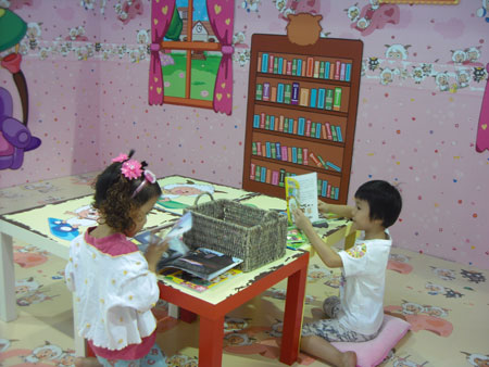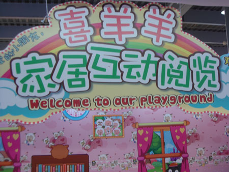 在喜羊羊的各個展覽區(qū)中,有一個面積20平米左右的“喜羊羊雜志家居互動閱覽區(qū)”吸引了眾多參觀者的眼球,尤其是小朋友們的注意力。整個展區(qū)用喜羊羊形象的壁紙和地板裝飾成一個兒童閱覽區(qū),供小朋友們在這個區(qū)域內(nèi)進行讀書和繪畫的體驗。粉色的喜羊羊形象壁紙讓進入其中的小朋友們樂不可支,連陪同的家長們都發(fā)出這樣的驚嘆,沒想到喜羊羊的可愛形象能夠在墻面上表達的這么生動可愛。