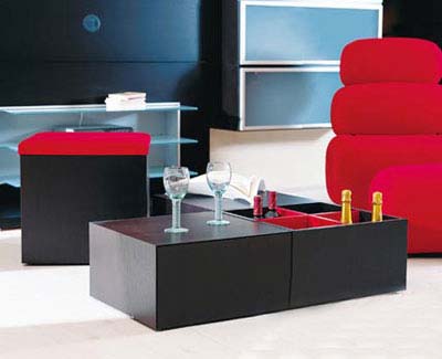 這套組合茶幾共由四部分組成,帶紅色布藝面的可以當坐位;里面有紅色隔斷的是酒架;另外兩個封閉式設(shè)計帶有手動按鎖,里面可以儲放客廳里的零碎物品。