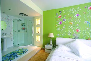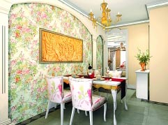 大花圖案目前引用在室內(nèi)裝飾中有幾種,一種是噴繪、手繪,手繪效果最好,但造價(jià)較高,很多人接受不了。而噴繪造價(jià)低一些,但可能沒有手繪那么有靈性。整個(gè)房間使用大花圖案時(shí)一定要注意,房間要夠大,花色要夠素,否則容易給人很燥很亂的感覺。