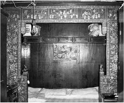 “徽州滿頂床”的床沿口一面,是一個紅彤彤、金閃閃、描龍繪鳳的“口”字形的床臉兒,最底下的床架主體是看不見的。上端橫有一塊鑲有花邊的長條板壁,兩側(cè)各有一頂天立地的長條板壁,它們與床沿下部的橫向板壁一起構(gòu)成中間空出的床門,床門內(nèi)側(cè)掛有中開式藍花土布門帳,開合自如。有些掛落,有些角飾,盡顯徽州木雕之技藝。床沿口一面的四周床臉板壁上,均漆上通紅的土漆,然后以金色線條勾畫上各種各樣的美麗、喜氣、祥和、民俗的圖案,諸如:龍鳳呈祥、花好月圓、麒麟送子、松鼠如意之類,有點喜氣洋洋、金碧輝煌的況味。床的內(nèi)壁表面則漆成暗紅色,在這樣的徽州滿頂床上下榻休憩,猶如躲進小木屋、身處童話境一般,美妙極了,舒服極了。比較講究點的“徽州滿頂床”,還在床內(nèi)的正壁上橫設(shè)一長條紅彤彤的抽屜櫥柜,一長列排開四個抽屜,放置些私房錢財、金銀首飾、換洗衣褲之類;櫥柜上面正好成為一長條案,可以擱置些古玩擺設(shè)和常用生活物品。