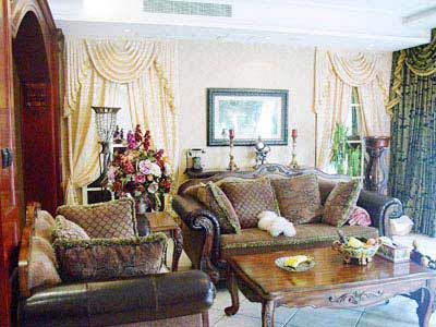 這是個歐式古典的小客廳,沙發(fā)區(qū)由一個3人沙發(fā)和兩個椅子構(gòu)成,非但不是成套的,連顏色也不相同,但是給人的感覺非常舒服。