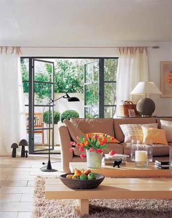 “只要實用”成為現(xiàn)代風格的口號,一經(jīng)提出,廣為傳誦。現(xiàn)代風格強調(diào)的是功能至上的原則,以最少的材料達到實現(xiàn)功能的要求。與現(xiàn)代人緊張忙碌的生活相適應(yīng),現(xiàn)代風格的客廳只強調(diào)必要的沙發(fā)、茶幾和組合電器裝置,不再有觀賞性強的壁爐和繁瑣的布藝窗簾等過分裝飾。圖一中墻面與天花處理成白色,避免小客廳的視覺壓抑,地面采用純天然木質(zhì)地板,美觀實用。將客廳延展至陽臺,擴大小客廳的面積,于窗下設(shè)置的臺板增強實用與休閑感,簡潔的羅馬窗簾與沙發(fā)、地毯相呼應(yīng),充滿了現(xiàn)代感。造型獨特的玻璃茶幾是小客廳的上佳之選,既活躍了居室氣氛,又避免打亂小客廳中原有的色彩平衡。