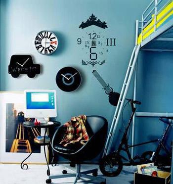 裝飾講究個性和偏好,把各種各樣的鐘表釘在墻上,灰色的墻面看起來不再呆板,有些童趣的造型,線條簡單,詼諧有趣,讓人心情愉悅,墻面也變得鮮活起來。