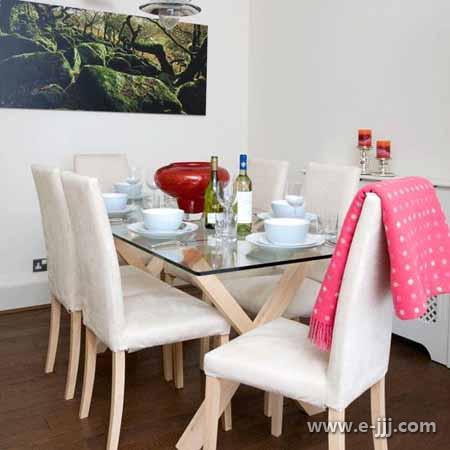 桌上的玻璃制品和白色織物裝飾的椅子,讓這個(gè)小小的區(qū)域很明亮。桌子中央用了暗紅色的花瓶來裝飾,墻上掛著一副巨幅風(fēng)景畫,是不是也很有一番趣味呢!
