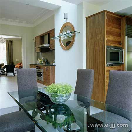 光滑的玻璃餐桌,精致而又明亮,深灰色的椅子成了這間開放廚房的焦點(diǎn)。桌上配上點(diǎn)綠色的小植物來裝飾,生氣和活力都有了,全家人在這里享用一頓晚餐,肯定相當(dāng)溫馨。