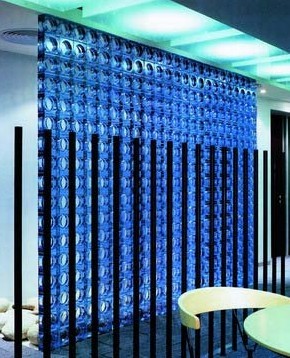 作為隔斷,這道藍(lán)色玻璃磚墻讓會客區(qū)和主人休息區(qū)都變得相對私密。使用的材料是玻璃磚,它有一定的透光性,因此具有迷幻色彩,當(dāng)燈光照到這道墻上時,反光又讓它會變得動感十足。
