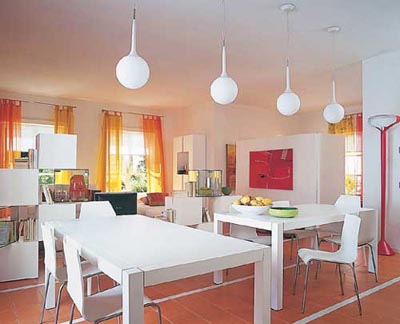 在起居室,你可以運(yùn)用不同光源的組合變化,依照自己的需要,創(chuàng)造出溫暖的氣氛或戲劇性的效果。最常被用來(lái)懸掛吊燈的地方通常是被用來(lái)款待賓客與家庭聚餐的用餐區(qū)間。最好是選擇那種可以調(diào)整高度的吊燈,如此一來(lái),才能在招待朋友聚餐時(shí),于餐桌上制造出親密的氛圍。然而,同時(shí)也必須考量它在一般時(shí)候的照明效果。