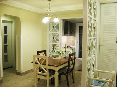 概要:   這是套案例的房子套內面積近130平,房型不錯,空間也夠大。這是進門的玄關,給人簡潔清新的感覺。鞋柜的上方擺放一些小飾品,與墻面的繪畫相印成趣?! ⌒P的全景,墻面及門都是淺色系。家具采用深色系的,增加了空間的厚重感。鞋柜旁擺放的換鞋凳與背后的鏤空隔斷同一色系,將田園風進行到底?! $U空隔斷的另一面是餐廳。屏棄了田園風的花色系,延用簡潔格調。