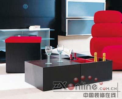 這套組合茶幾共由四部分組成,帶紅色布藝面的可以當(dāng)坐位;里面有紅色隔斷的是酒架;另外兩個(gè)封閉式設(shè)計(jì)帶有手動(dòng)按鎖,里面可以儲(chǔ)放客廳里的零碎物品。 海裝潢網(wǎng) 海裝潢網(wǎng)