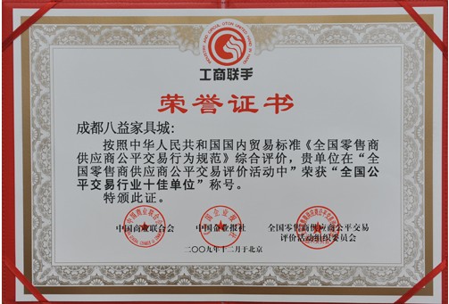 新華網四川頻道12月24日電 由中國商業(yè)聯(lián)合會、中國企業(yè)報社聯(lián)合主辦的“全國零售供應商公平交易評價活動”于2009年12月19日在北京全國人大會議中心舉行了隆重的揭曉儀式,成都八益家具城在眾多企業(yè)的角逐中脫穎而出,榮獲“全國公平交易行業(yè)十佳單位”。
