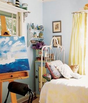 最適合于夏日午后時光流連的舒服小床,簡潔的鐵藝床頭富于美感,手感厚實(shí)溫暖的白色床罩和窗簾,搭配淺藍(lán)色的墻壁和家具,氣氛寧靜。大小不同的靠墊有很好的裝飾效果。