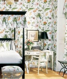 紛繁富麗的墻布令人感覺仿佛走進(jìn)野花遍地的樹林,林中蕭蕭的樹葉聲中傳來清幽的鳥鳴,黑胡桃木的床好象就擺在樹林中,白色的床罩和黑白條紋的靠枕簡潔而理性,與漂亮的墻布形成鮮明而生動的對比。