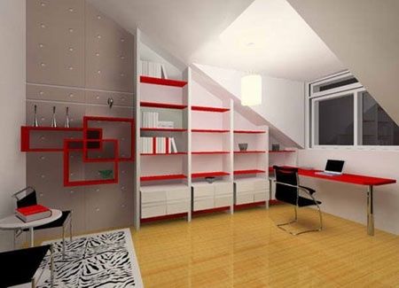 一間簡單的書房一般陳設(shè)有寫字臺、電腦操作臺、書柜、坐椅等。書房的家具除了要有書櫥、書桌、椅子外,兼會客用的書房還可配備沙發(fā)茶幾等。書櫥應(yīng)靠近書桌以便存取方便,書櫥中可留出一些空格來放置一些工藝品以活躍書房的氣氛,書桌應(yīng)置于窗前或窗戶右側(cè),以保證看書、工作時有足夠的光線,并可避免在桌面上留下陰影。書桌上的臺燈應(yīng)靈活、可調(diào),以確保光線的角度、亮度,還可適當(dāng)布置一些盆景、字畫以體現(xiàn)書房的文化氛圍。