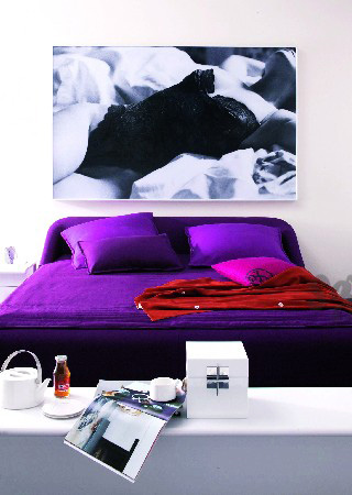概要: 簡單的黑白兩色構(gòu)成主色調(diào),純黑的墻面、鋪天蓋地的更衣柜、木地板,構(gòu)成一種比較前衛(wèi)的臥室布置,而上部裸露的白墻、天花板上白色吊燈、白色地墊這些大面積的白色調(diào)又調(diào)和出整體空間的純潔美感。床頭的橙紅靠板、更衣間的橙色座椅,映襯著黑色床框,分外鮮明生動?!『诎譜S淺紫  夏日炎炎,家成了避暑的港灣。