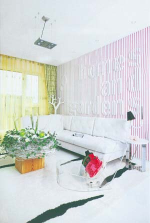 一進門面對的就是客廳的沙發(fā)背景墻,條絨布質感的豎條紋墻面從視覺上增加了空間高度,淡粉色的底色上用白色豎條紋做出立體字母,顏色和諧溫馨,延展了視覺空間。