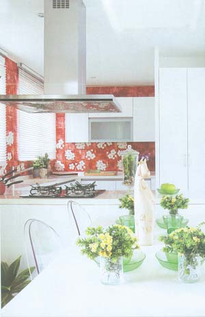 不規(guī)則的紅色花磚組合是這個與小餐廳相連的開放式廚房的亮點,也成為客廳、廚房之間的自然過渡。