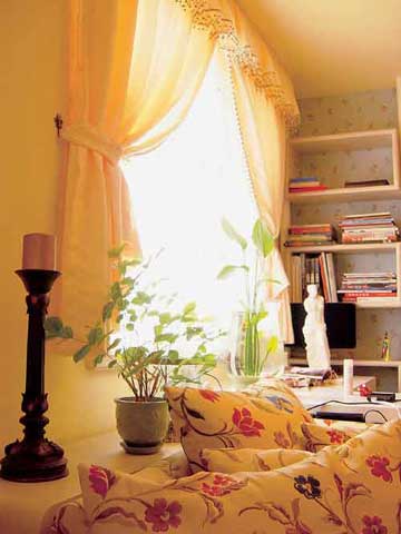 窗臺(tái)的綠植與沙發(fā)的花朵圖案,籠罩在鵝黃色紗簾下的柔和陽(yáng)光里,綻放一室的溫馨芬芳。
