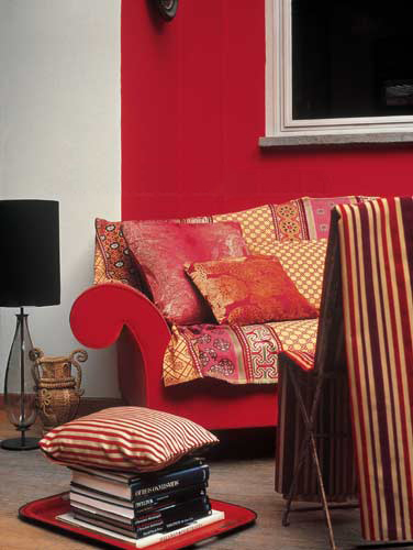 即使是西式的家居布置,同樣可以選用艷麗的東方風(fēng)格布藝做裝點(diǎn)。東方艷麗風(fēng)格布藝的紅色恰好與空間里的紅色墻壁、沙發(fā)屬于同一個(gè)色系,搭配出十分和諧的效果。西亞的建筑圖案與中國(guó)的傳統(tǒng)紋樣疊在一起使用,并且搭配了材質(zhì)相近、顏色相似的條紋布藝作為橋梁,令東方艷麗的風(fēng)格更為突出,與居室整體的風(fēng)格也更加諧調(diào)。