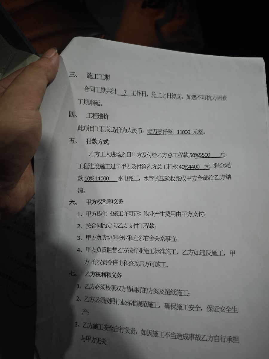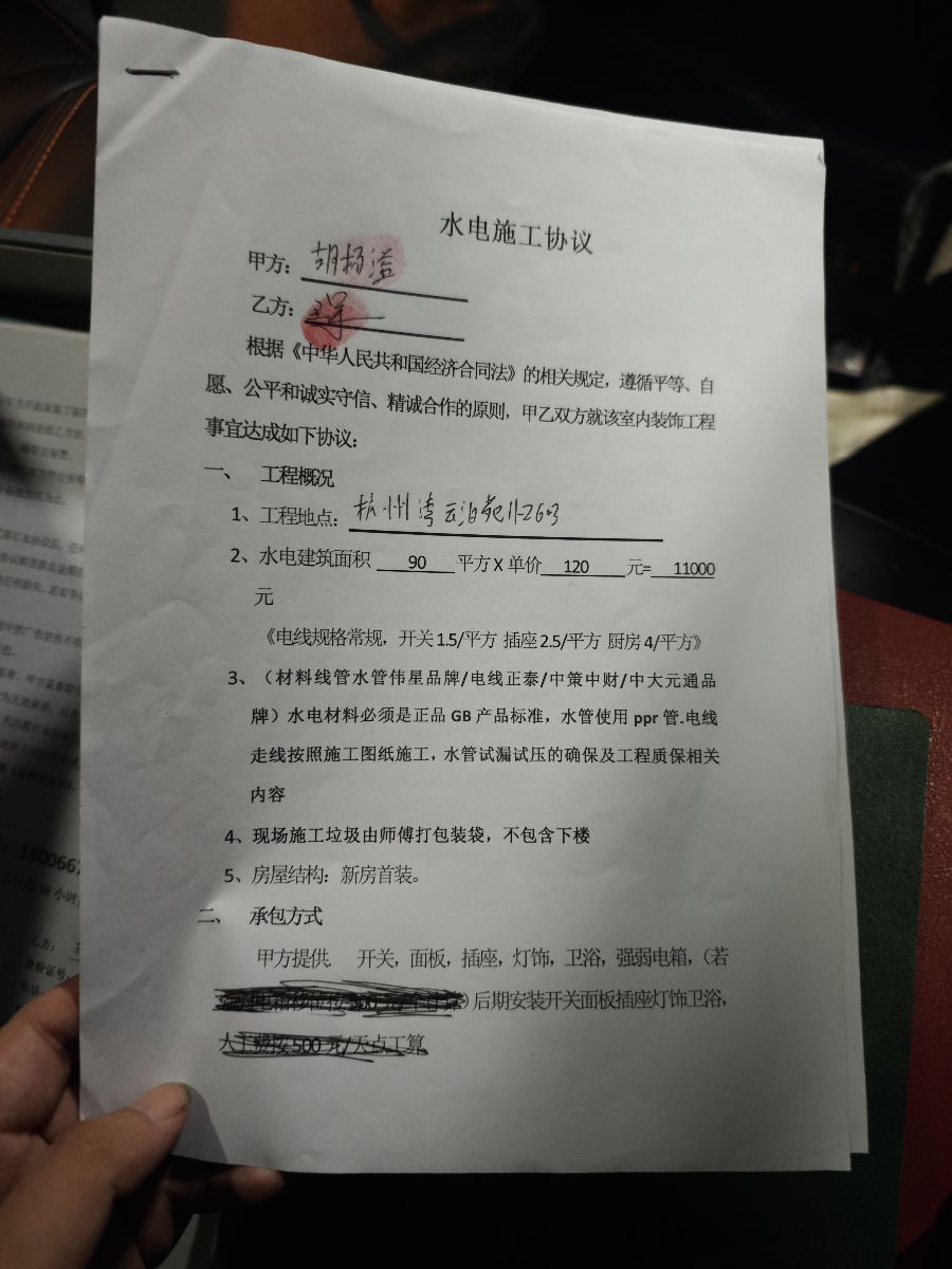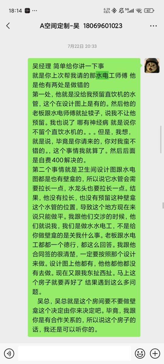 2025年5月13號,我在紹興品家簽訂了水電工的協(xié)議。在合同上寫著要按照設(shè)計(jì)圖紙來,結(jié)果在廚房沒有安給我安安裝洗碗機(jī)的一個(gè)位置,并且就是有個(gè)插板安不上去,沒有經(jīng)過我的同意,把瓷瓷磚給我敲掉了。導(dǎo)致我這個(gè)房子有點(diǎn)破損,在合同上寫明了衛(wèi)浴燈飾他都會(huì)給我安裝的結(jié)果,他大燈沒有給我安裝,還要拖延我很多時(shí)間,也表明不想安裝。最后一個(gè)就是直飲機(jī)口有飲直飲機(jī)的位置,結(jié)果他沒有給我預(yù)留。后期還是我找人去預(yù)留的,他們也不認(rèn)這個(gè)事兒。