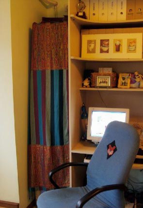 現(xiàn)在上面那張的左邊空隙,我在淘寶上定做了一個架子,結(jié)果對方?jīng)]有嚴(yán)格按照我的尺寸,弄得兩邊都有點縫,也不好看,我很苦惱,想了半天,終于想到用一個自己的披肩給外面一搭 呵呵居然不覺得難看,藏了好多亂七八糟的東西哦。