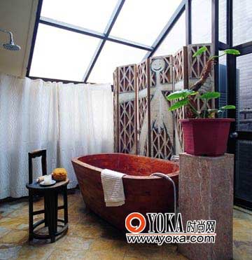 將露臺(tái)改成浴室,明亮的天頂采光,放在浴室中間的木質(zhì)浴盆,粗獷的石材地面以及帶有強(qiáng)烈的民族圖騰式裝飾紋樣的屏風(fēng),組合成質(zhì)樸、渾然天成的原生態(tài)氛圍。這種風(fēng)格的設(shè)計(jì)靈感,最初來(lái)源于廣袤的非洲大地,原生態(tài)風(fēng)格的居室出現(xiàn)在都市住宅里,使都市新貴尋覓到返樸歸真的自在空間。
