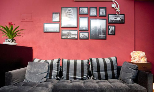 灰色的沙發(fā)和黑框相冊遇上紅色背景墻,熱情中帶著一絲沉著,加上植物的小小綠色點綴,營造出強(qiáng)烈的視覺效果。