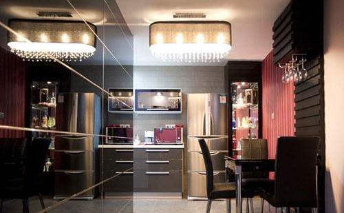 餐廳的一面墻用反光內(nèi)墻磚裝修,使空間放大,另一面紅色的墻紙暖意十足。水晶吊燈映照在反光墻面上,效果很贊!整個廚房色彩搭配及設(shè)計勝過客廳。