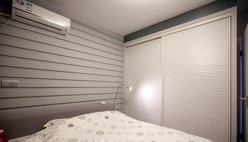 臥室墻面采用白色橫條紋,層次感十足。整個色系以灰色為主,加上燈光照明顯得居室空間很有質(zhì)感。