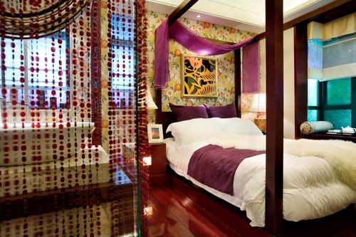 白色的床上用品,紫色的布幔,紫色珠簾,墻面的花紋墻紙。它們的組合讓主臥帶有一點(diǎn)“香艷”的味道。