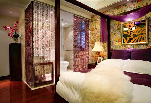 衛(wèi)浴間設(shè)計(jì)在臥室內(nèi),由玻璃和紫色珠簾隔開(kāi),白色的潔具與紫色珠簾的搭配看上去很美艷。純白和紫色的軟裝設(shè)計(jì)格調(diào),凸顯出臥室的迷人和優(yōu)雅,嫵媚的感覺(jué)洋溢其中。