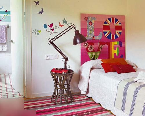 床頭明艷的拼接面料個(gè)性十足,純白色的棉質(zhì)品柔和了豐富的色彩。圓點(diǎn)、花案、抽象圖案,以及艷麗的色彩在大面積留白中,平衡了繁復(fù)與簡(jiǎn)約兩種氣質(zhì)。