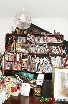 走進胡菲家里,還沒等看清楚大概的樣貌,首先就被引入了靠里側(cè)的書房。房間不大,一打開門,迎面就撞見一整面書架。兩個方形交錯疊置的樣子,以及整體黑色油漆底色上,內(nèi)層方形的邊框與隔斷被刷成跳躍的紅色,使它乍看起來好似一個碩大的藝術(shù)裝置,懸掛在正對著門的那面墻上。胡菲和先生都是老師,對書籍的愛好自不待言,而對書架的要求則是希望使它本身就能表現(xiàn)出某種藝術(shù)感覺。因此胡菲自己設(shè)計了這樣一個特別的樣子,延請工匠師傅來做??梢韵胍姡瑴贤ㄉ匣ㄙM了不少力氣,好在她自己能畫圖樣,雖然最后做出來尺寸略有出入,兩個方形并非同等大小,不過對本身便有交錯感覺的書架而言,不對稱亦是一種韻律。等工匠師傅刷好黑色油漆做底之后,胡菲又自己動手,給中央的方形和隔斷刷上紅色油漆。配色的靈感當(dāng)然源自她繪漆畫的感覺,那種手工的痕跡看起來也頗有趣味。