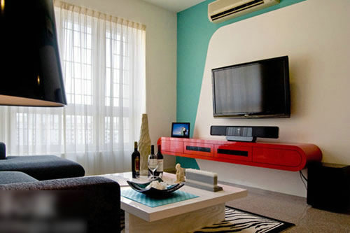 純凈且不失活力的房間基調(diào),酒瓶造型的飾品簡潔利落,立體感強。電視背景墻上大面積的亮色色塊增添了房間的生機活力,將快樂的氣氛傳播開來。留白的墻面被涂刷上了極亮的藍色邊框,與紅色電視柜強烈的對比沖撞搭配,似乎隨時都在迸發(fā)出主人對生活的**?!?/p>