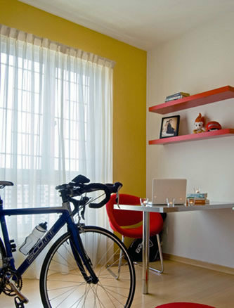 黃色的墻面與鮮亮的紅色座椅搭配,讓整個工作室顯得精彩十足。加些天真活潑的飾品讓枯燥的時光變得輕松而富有情趣。輕薄的窗紗讓整個空間富有靈動感。