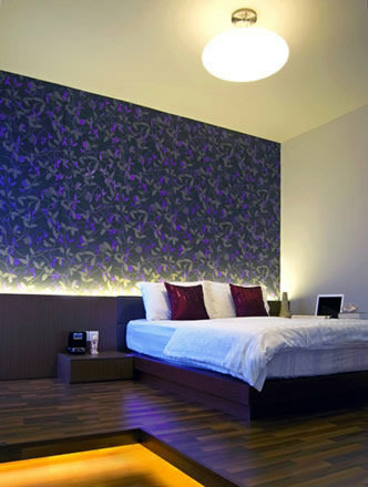 采用蝴蝶圖案的紫色壁紙來點綴大面積的臥室背景墻,打破了空間純色的單調(diào),擴大視覺范圍而不煩亂;與地臺下的黃色燈光形成強烈的對比運用,卻有說不盡的溫馨感?!?/p>