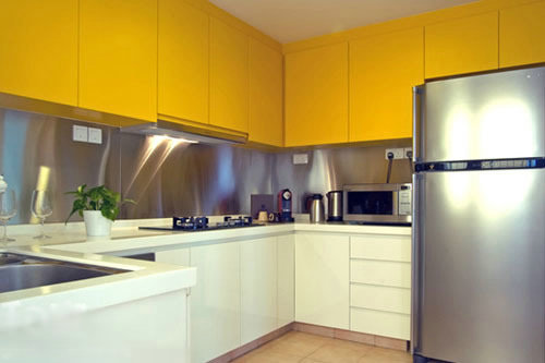 黃色的吊柜具有容易打動人的色感,暖色調(diào)的廚房透著一股親和力,帶來溫馨感覺,而白色的廚柜及金屬貼面的墻壁干凈整潔,為整體空間帶來寬闊感,讓多彩的熱力在整個廚房中蔓延開來,從此享受起有色的美食生活。